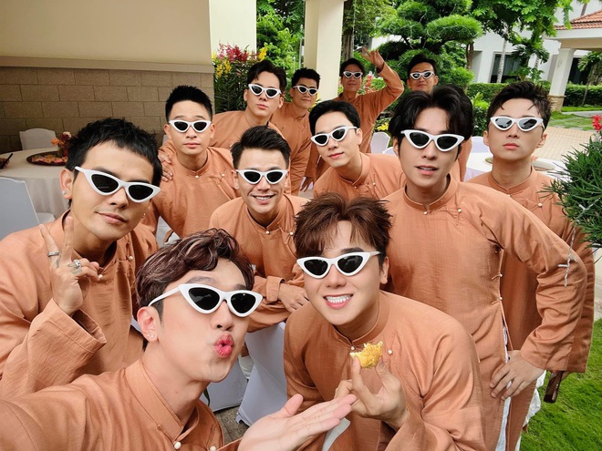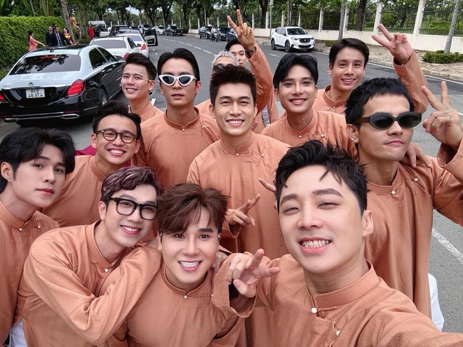 Thiếu gia Minh Đạt chọn chiếc áo dài đỏ rực, trên vai cài hoa tươi chuẩn bị sang đón vợ. Dàn bê tráp nhà trai toàn những người bạn thân thiết với cô dâu như Trần Anh Huy, Tiko Tiến Công, Quang Huy, Otis, Hải Nam, Minh Xù, Quang Bảo, Lãnh Thanh, Cao Xuân Tài... Các thành viên đội bê tráp được Midu và Minh Đạt đặt may áo dài riêng.