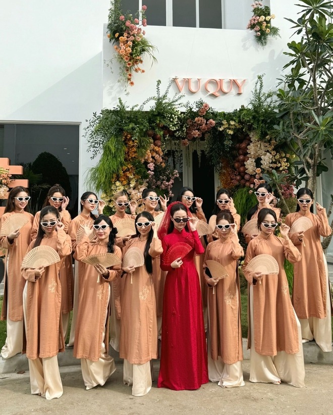 Nhiều người bạn thân của cô dâu Midu đã xuất hiện trong đội hình bê tráp. Một số nhân vật nổi bật có thể kể đến như Phương Mỹ Chi, Tú Hảo, Tam Triều Dâng, Dương Hoàng Yến, Kiều Trinh Xíu... Như đội hình nhà trai, các mỹ nhân Vbiz cũng được cô dâu may tặng áo dài riêng.