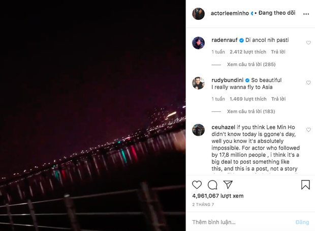 Dù hiện tại đang vướng tin đồn "phim giả tình thật" với Kim Go Eun nhưng nam tài tử vẫn thản nhiên đăng clip ca khúc "My love by my side" (nhạc phim "Reply 1988") như một lời nhắn nhủ dành cho ai đó. Đáng nói, dạo gần đây, Lee Min Ho thường xuyên chia sẻ các bài hát về tình yêu khiến dân tình không khỏi liên tưởng đến chuyện tình với Kim Go Eun.