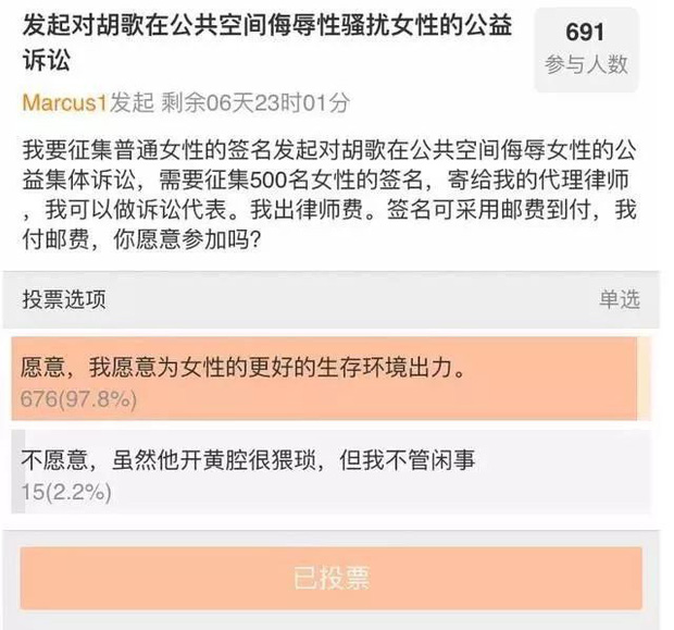Hành động này đã khiến cho Hồ Ca 1 lần nữa bị tố là "kỳ thị phụ nữ", thậm chí còn có blogger lên tiếng muốn khởi kiện Hồ Ca "quấy rối tình dục phụ nữ ở nơi công cộng", ngoài ra muốn thu thập chữa ký của 500 phụ nữ để tiến hành khởi tố theo pháp luật. Dù sự kiện này không đi được đến cùng, Hồ Ca cũng chưa bao giờ trực tiếp lên tiếng đáp lại nhưng cũng khiến cho hình tượng của nam diễn viên phần nào bị ảnh hưởng.