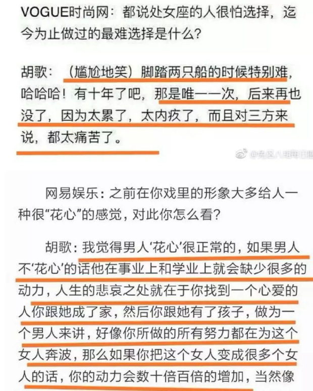 Bên cạnh đó, thông tin về việc Hồ Ca "bắt cá 2 tay" cũng khiến cho dư luận phải xôn xao. Trong 1 cuộc phỏng vấn, khi được hỏi về thời điểm đã đưa ra 1 quyết định lựa chọn khó khăn nhất từ trước tới nay, Hồ Ca đã thừa nhân mình từng "chân giẫm 2 thuyền". Không chỉ thế, anh còn tuyên bố đàn ông lăng nhăng là chuyện rất bình thường và khi 1 người đàn ông có nhiều mối quan hệ với nhiều người phụ nữ, anh ta sẽ càng mạnh mẽ hơn. Những lời nói này đã khiến cho nam tài tử bị chỉ trích là "kẻ cặn bã" trong 1 thời gian dài.