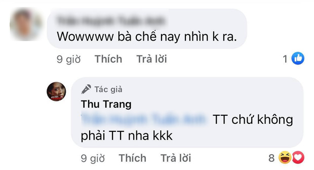 Những tưởng Thu Trang cảm thấy khó chịu nên mới lên tiếng đầy kiên quyết như thế, nhưng dưới phần bình luận, cô lại có động thái khiến dân tình "té ngửa". Cụ thể, khi có người khen ngợi Thu Trang ngày càng lột xác khó nhận ra, nữ diễn viên đã hóm hỉnh đáp lại: "TT chứ không phải TT nha". Vì cả tên Thu Trang và Tóc Tiên đều có thể viết tắt là "TT" nên câu trả lời của cô lại càng khiến khán giả thêm bối rối, không biết bà xã Tiến Luật đang muốn nhắc đến ai.