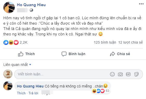 Trong bài đăng mới nhất cách đây ít giờ, giọng ca "Không cảm xúc" cũng ngầm khẳng định mình đang độc thân bằng câu chuyện tưởng vô thưởng vô phạt. Vẫn giọng điệu tưng tửng hài hước thường thấy, Hồ Quang Hiếu kể: "Hôm nay vô tình ngồi cafe gặp lại một cô bạn cũ. Lúc mình đứng lên chuẩn bị ra về em ý còn cố hét theo: 'Chúc anh lấy được vợ tốt và đẹp nha'. Thế là cả quán đang ngồi nó quay lại nhìn mình như kiểu mình vừa đá em ấy đi theo người khác vậy. Trong khi người yêu còn không có. Ngại thật sự". Bên dưới phần bình luận, anh còn than thở: "Có tiếng mà không có miếng... chán".