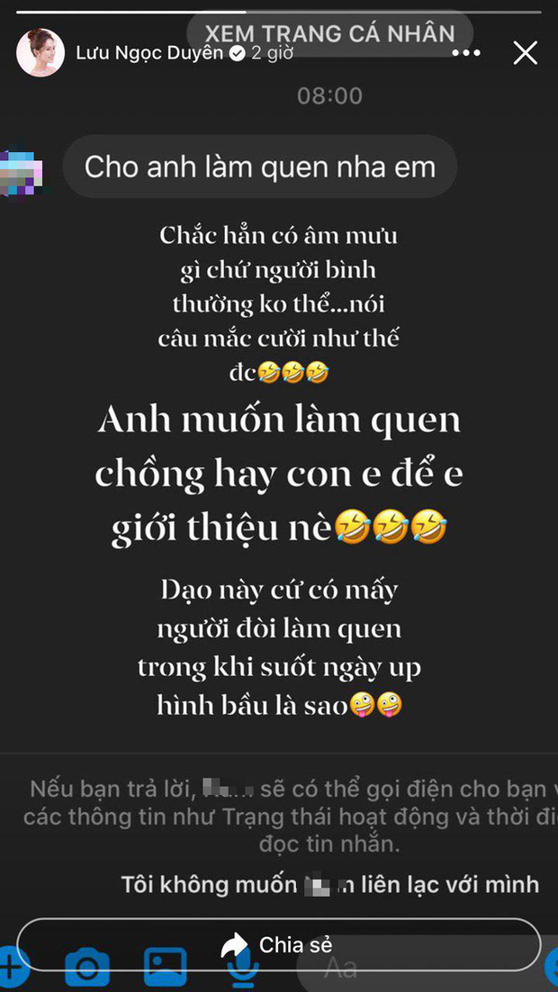 Thế nhưng mới đây, giọng ca "Đừng như thói quen" lại gặp phải tình huống dở khóc dở cười khi bị một người lạ nhắn tin làm quen, cưa cẩm. Bà xã Dương Khắc Linh cũng cho biết đây không phải lần đầu tiên cô gặp trường hợp như thế này mà trong suốt thời gian mang bầu, cô liên tục nhận được những tin nhắn có nội dung tương tự.
