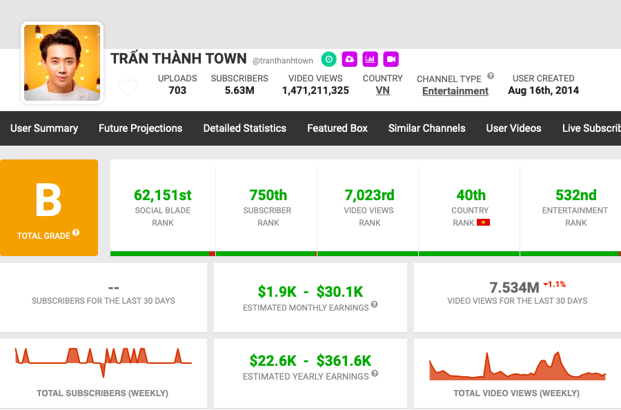 Không những thế kênh YouTube Trấn Thành Town của nam MC cũng là một kênh kiếm tiền. Theo thống kê từ Social Blade, trong 30 ngày qua, kênh YouTube Trấn Thành Town mang về doanh thu 1.900 - 30.100 USD, tức dao động từ 45 - 700 triệu đồng.