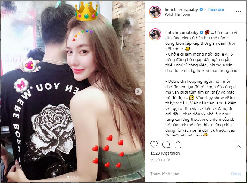 "Cám ơn anh vì dù công việc có bận bịu thế nào anh cũng luôn sắp xếp thời gian dành trọn hết cho em. Chở em đi làm móng ngồi đợi em 4, 5 tiếng đồng hồ ngáp dài ngáp ngắn thiếu ngủ vì công việc vẫn chờ đợi em mà không hề kêu than tiếng nào.