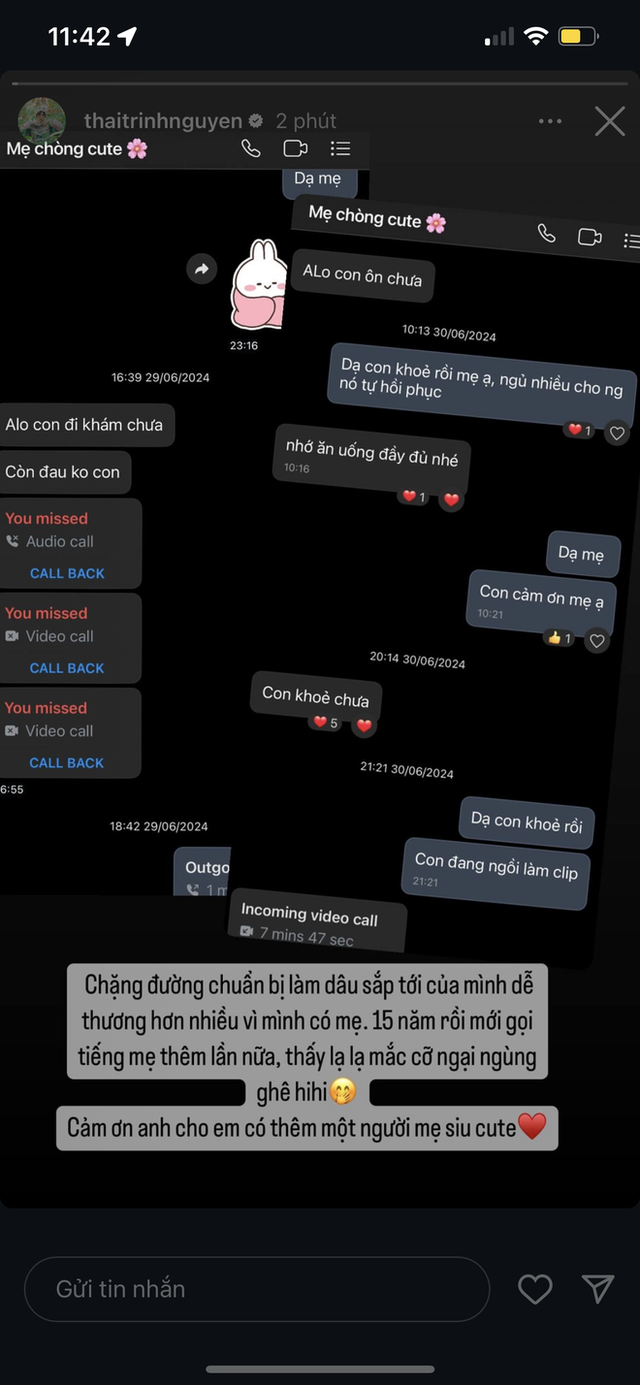 Thái Trinh từng bày tỏ sự vui mừng khi có người mẹ chồng tâm lý, thấu hiểu: "Chặng đường chuẩn bị làm dâu sắp tới của mình dễ thương hơn nhiều vì mình có mẹ. 15 năm rồi mới gọi tiếng mẹ thêm lần nữa, thấy lạ lạ mắc cỡ ngại ngùng ghê. Cảm ơn anh cho em có thêm một người mẹ siêu dễ thương".