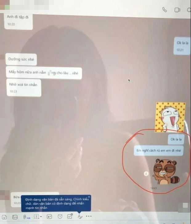 Đáng chú ý, ngay sau bài đăng "bóc phốt", T.C còn tung thêm loạt tin nhắn được cho là của H.N với người yêu cũ. Trong tin nhắn, bộ đôi nam nữ thoải mái nói chuyện tình dục rất mạnh bạo và nhạy cảm như chưa hề chia tay. Họ cũng hẹn nhau "mây mưa", thậm chí nam chính còn muốn đối phương rủ thêm người tham gia.