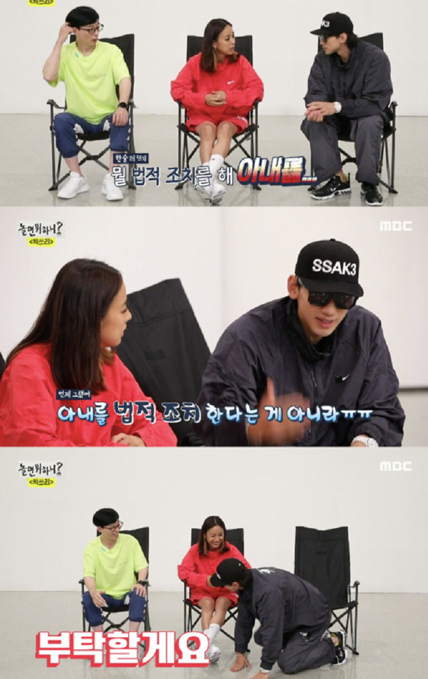 Lúc này, Bi Rain mới giật mình xua tay: "Không đâu. Em không hề có ý nói rằng sẽ kiện cô ấy. Nếu giờ em không giải thích kỹ thì các bài báo sẽ đưa tin tức gây hiểu lầm mất. Làm ơn đừng nói thế mà. Em xin anh chị đấy". Vừa nói nam ca sĩ vừa quỳ xuống để xin khiến Yoo Jae Suk và Lee Hyori được phen cười nghiêng ngả.