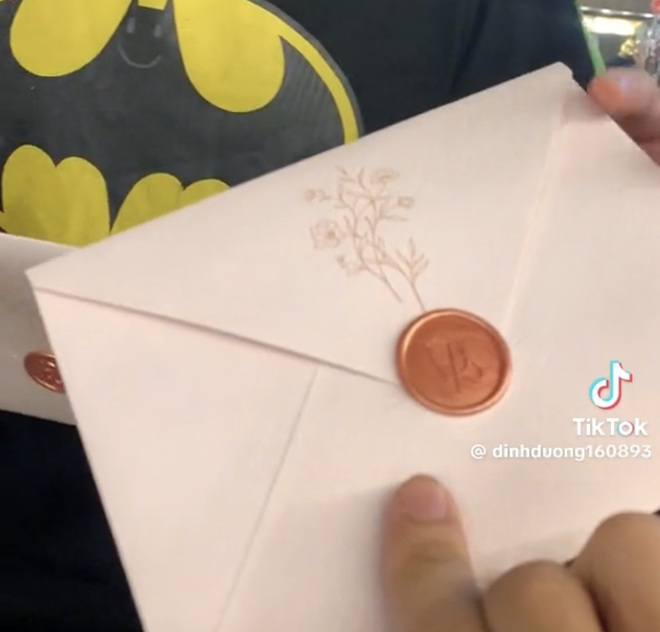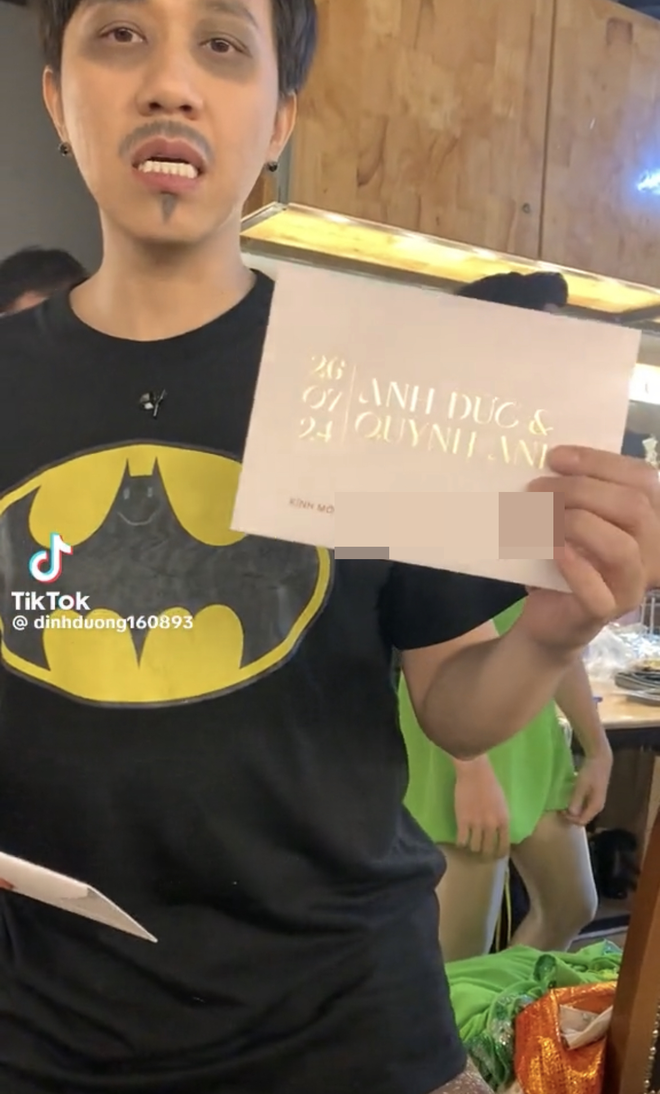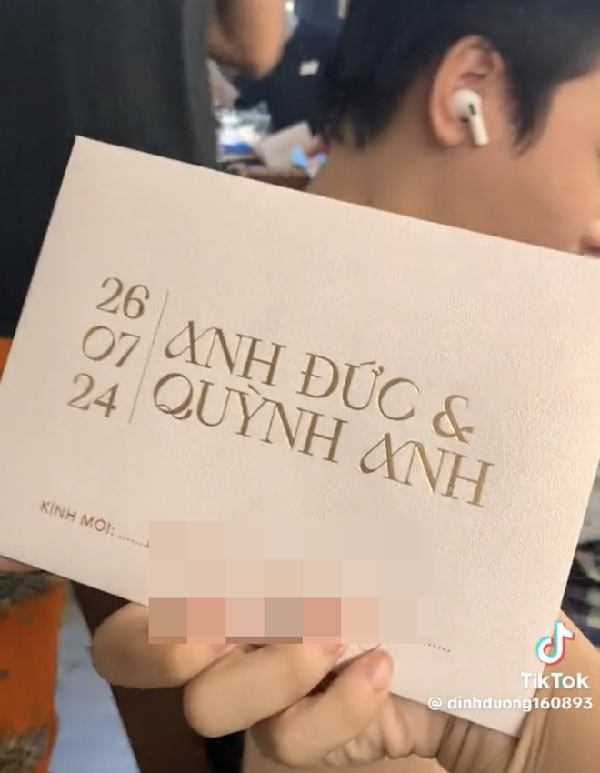 Theo đó, tranh thủ dịp đi diễn ở sân khấu, diễn viên Anh Đức đã phát thiệp mời đến bạn bè và đồng nghiệp. Cặp đôi chọn màu hồng cam nhẹ nhàng, thiết kế thiệp khá đơn giản. Bên ngoài bìa có tên chú rể Anh Đức, cô dâu Anh Phạm kèm ngày diễn ra đám cưới là 26/7/2024, cặp đôi dùng con dấu có ký hiệu riêng Đ&A để đóng vào từng chiếc thiệp mời. Nam diễn viên còn dặn dò khách mời cố gắng sắp xếp thời gian để có thể đến chung vui cùng vợ chồng anh.