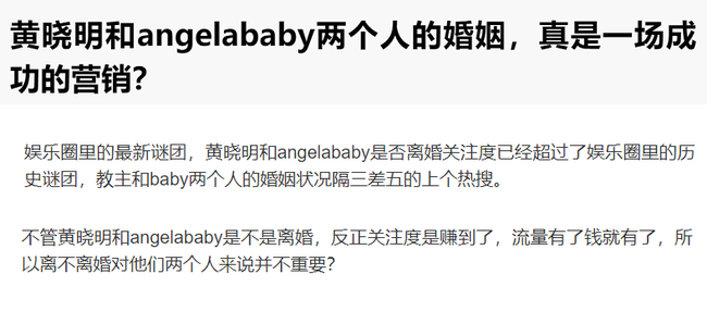 Tuy nhiên, theo trang Baijiahao thì cái được gọi là "bí mật" này thực tế chỉ là chiêu trò để thu hút sự chú ý của vợ chồng tài tử Thần điêu đại hiệp mà thôi. Trong đó, Angelababy được coi là người thể hiện rõ ý tứ và luôn có động thái ngầm xác nhận đã ly hôn như ám chỉ Huỳnh Hiểu Minh ngoại tình, tỏ thái độ thờ ơ với chồng và cũng không gửi lời chúc mừng nhân dịp sinh nhật anh. Nhưng sau đó, dân tình lại thấy chính Angelababy mặc đồ đôi với Huỳnh Hiểu Minh, ngầm phủ nhận những động thái trước đó của mình.
