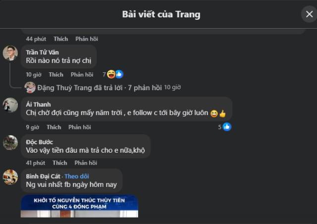 Dòng trạng thái này của "chủ nợ" Thùy Tiên nhanh chóng thu hút lượng tương tác và bình luận lớn. Hầu hết các bình luận đều chúc mừng bà Trang vì nhớ lại vụ xé giấy nợ của Thùy Tiên năm xưa. Nhiều khán giả còn bình luận trong bài viết, cho rằng bà Trang là "người vui nhất fb ngày hôm nay".