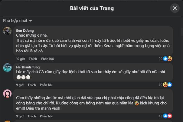 Tuy nhiên, dòng trạng thái này sau đó đã được bà Trang xóa đi và thay vào đó là một bài đăng mới với nội dung "Cái gì đến cũng đến rồi ! Giờ m xin phép IM LẶNG ngồi hóng thôi ạ. Đúng sai đã tỏ tường".