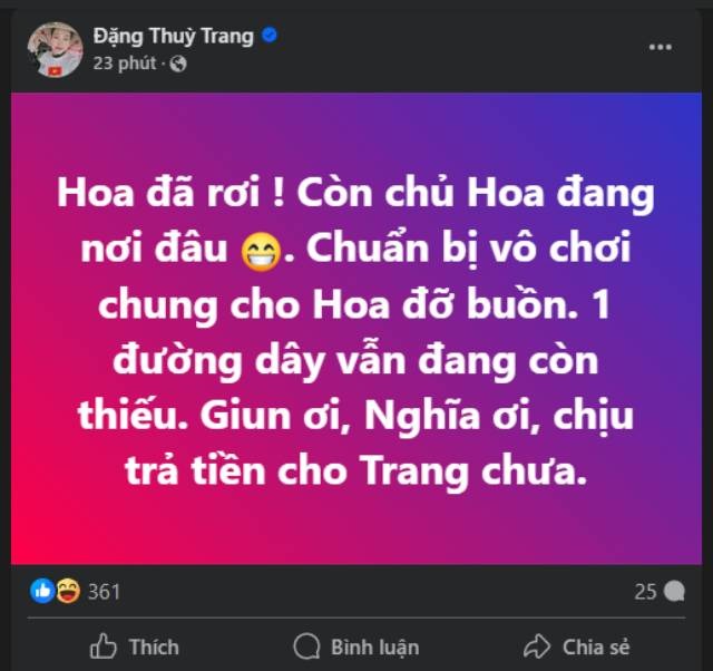 Bà Trang cũng không phủ nhận "niềm vui lớn" này và còn tiếp tục có thêm dòng trạng thái gây xôn xao vào sáng nay 20/5. Nội dung bài đăng "Hoa đã rơi! Còn chủ Hoa đang nơi đâu. Chuẩn bị vô chơi chung cho Hoa đỡ buồn. 1 đường dây vẫn đang còn thiếu. Giun ơi, Nghĩa ơi, chịu trả tiền cho Trang chưa".