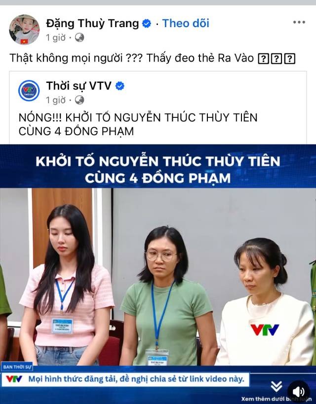 "Chủ nợ" của Thùy Tiên đã đăng tải dòng trạng thái vào tối ngày hôm qua 19/5 với nội dung ngắn gọn: "Thật không mọi người? Thấy đeo thẻ ra vào?". Dòng trạng thái đi kèm bài viết được chia sẻ từ fanpage "Thời sự VTV" có hình ảnh Thùy Tiên bị cơ quan chức năng bắt tạm giam và chính thức khởi tố. Xe máy