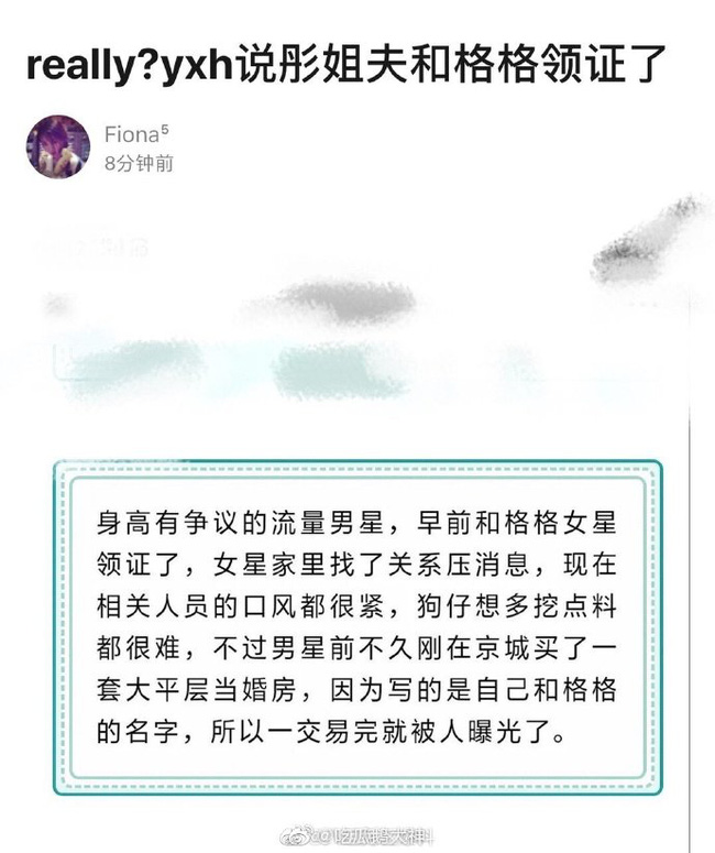 Người này đăng tin với nội dung: "Một nam ca sĩ nổi tiếng với chiều cao đáng tranh luận đã sớm lĩnh giấy đăng ký kết hôn cùng với nữ diễn viên tiểu thư xinh đẹp. Phía nhà nữ đã nhờ quan hệ để che giấu thông tin, nhân viên công tác của hai nhà đều kín tiếng nên rất khó moi móc được thông tin. Nhưng mà phía nhà trai đã sớm mua một căn nhà lớn tại Bắc Kinh để làm phòng cưới, lại căn nhà lại để dưới tên cô dâu nên tin tức này mới lọt ra ngoài".