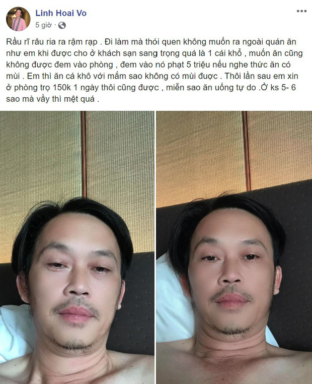 Cũng chính vì thói quen ăn uống đạm bạc này nên mới đây, khi phải ở trong khách sạn 5 sao cao cấp, nghệ sĩ Hoài Linh đã không tránh khỏi cảm giác bất tiện và khó chịu. Trên trang cá nhân, anh đăng tải dòng trạng thái than thở: "Đi làm mà thói quen không muốn ra ngoài quán ăn như em khi được cho ở khách sạn sang trọng quả là một cái khổ. Muốn ăn cũng không được đem vào phòng, đem vào nó phạt 5 triệu nếu thức ăn có mùi. Em thì ăn cá khô với mắm sao không có mùi được? Thôi lần sau em xin ở phòng trọ 150k/1 ngày thôi cũng được, miễn sao ăn uống tự do. Ở khách sạn 5 - 6 sao mà vầy thì mệt quá".