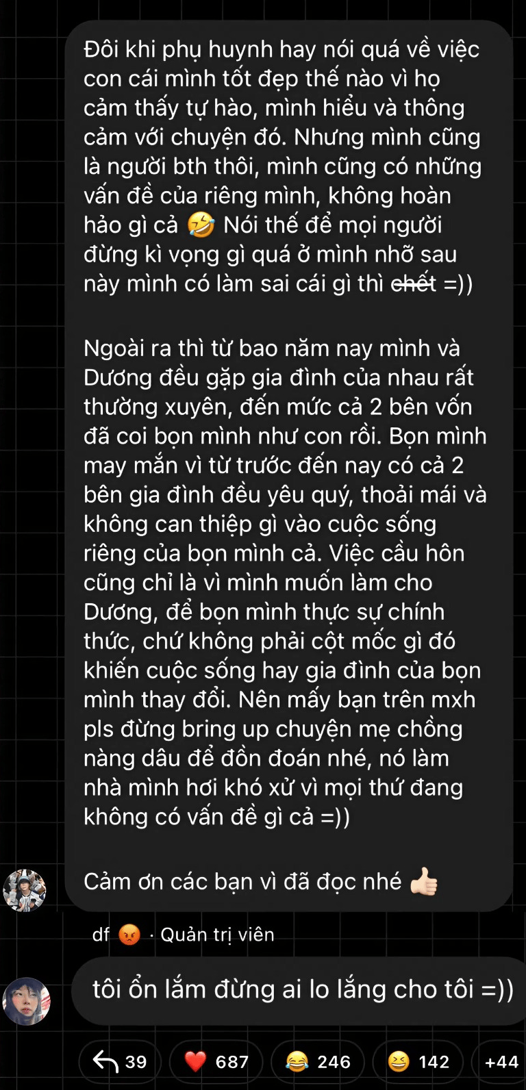 Đáng chú ý, "phù thủy âm nhạc" Rap Nhà Làm cũng khẩn thiết mong cộng đồng mạng ngừng đồn đoán về câu chuyện mẹ chồng - nàng dâu: "Làm ơn đừng mang chuyện đó ra để đồn đoán, nó làm nhà mình hơi khó xử vì mọi thứ đang không có vấn đề gì cả". Tiếp lời bạn trai, Dương Fynn cũng trấn an người hâm mộ bằng dòng tin nhắn ngắn gọn: "Tôi ổn lắm đừng ai lo lắng cho tôi".