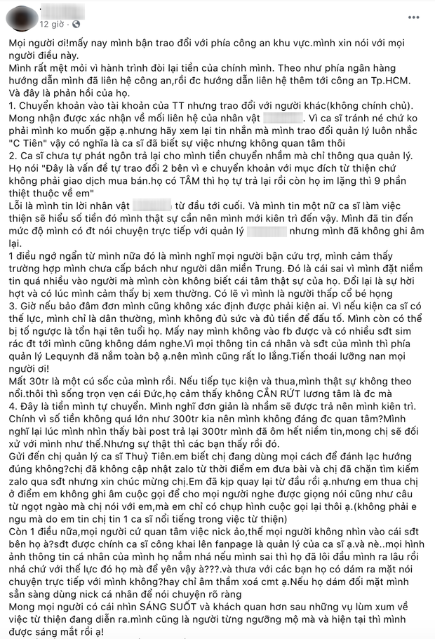 Những ồn ào xoay quanh chuyện Thuỷ Tiên kêu gọi cứu trợ miền Trung dường như chưa có dấu hiệu dừng lại. Đáng nói nhất, 1 khán giả tên T.H đã bất ngờ có bài đăng yêu cầu Thuỷ Tiên lên tiếng về việc chuyển khoản nhầm 300 nghìn thành 30 triệu đồng. Sau 5 lần 7 lượt hối thúc quản lý của nữ ca sĩ, T.H khẳng định vẫn không được hoàn tiền lại. Thậm chí, tối ngày 28/3, khán giả này còn đăng đàn tố quản lý của Thuỷ Tiên đã chặn Zalo đính kèm loạt ảnh, video bằng chứng.