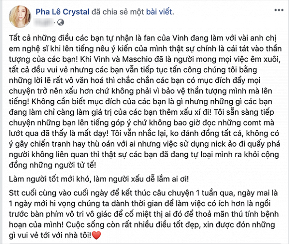 Pha Lê viết: "Tất cả những điều các bạn tự nhận là fan của Vinh đang làm với vài anh chị em nghệ sĩ khi lên tiếng nêu ý kiến của mình thật sự chính là cái tát vào thần tượng của các bạn! Khi Vinh và Maschio đã là người mong mọi việc êm xuôi, tất cả đều vui vẻ nhưng các bạn vẫn tiếp tục tấn công chúng tôi bằng những lời lẽ rất vô văn hoá thì chắc chắn các bạn có mục đích đẩy mọi chuyện trở nên xấu hơn chứ không phải vì bảo vệ thần tượng mình mà lên tiếng! Không cần biết mục đích của các bạn là gì nhưng những gì các bạn đang làm chỉ càng làm giá trị của các bạn thêm xấu xí đi! Tôi sẵn sàng tiếp chuyện những bạn lên tiếng góp ý chứ không bao giờ đọc những comt mà lướt qua đã thấy là mất dạy! Tôi vẫn nhắc lại, ko đánh đồng tất cả, không có ý gây chiến tranh hay thù oán với ai nhưng việc sử dụng nick ảo đi quấy phá người không liên quan thì thật sự các bạn đã đang tự loại mình ra khỏi cộng đồng những người tử tế!"