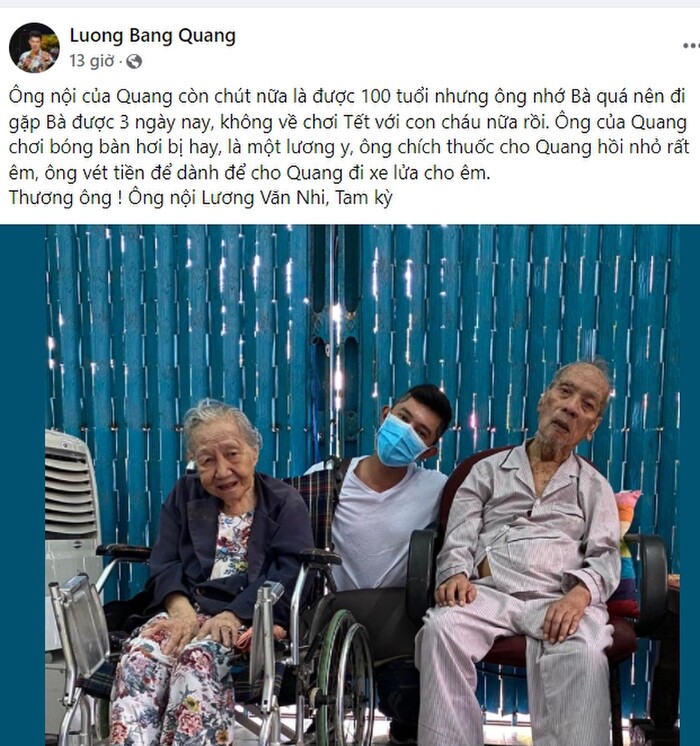 Mới đây trên trang cá nhân của mình, ca sĩ Lương Bằng Quang đăng tải bài viết tiết lộ ông nội của vừa mới mất: "Ông nội của Quang còn chút nữa là được 100 tuổi nhưng ông nhớ bà quá nên đi gặp bà được 3 ngày nay, không về chơi Tết với con cháu nữa rồi. Ông của Quang chơi bóng bàn hơi bị hay, là một lương y, ông chích thuốc cho Quang hồi nhỏ rất êm, ông vét tiền để dành để cho Quang đi xe lửa cho êm. Thương ông!".