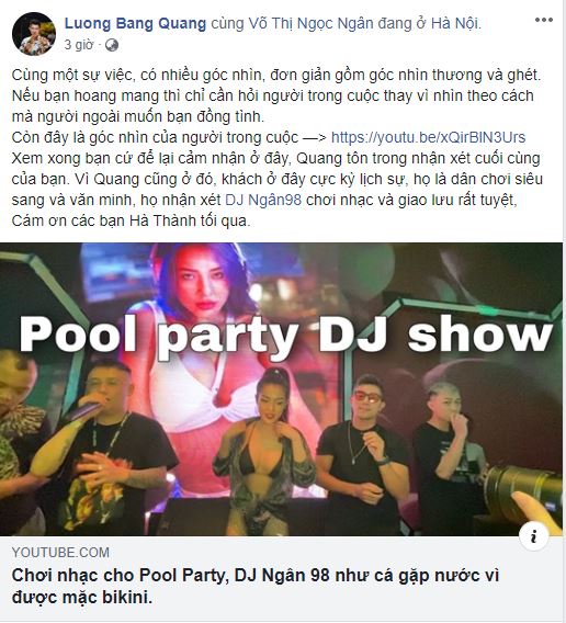 "Cùng một sự việc, có nhiều góc nhìn, đơn giản gồm góc nhìn thương và ghét. Nếu bạn hoang mang thì chỉ cần hỏi người trong cuộc thay vì nhìn theo cách mà người ngoài muốn bạn đồng tình. Quang cũng ở đó, khách ở đây cực kỳ lịch sự, họ là dân chơi siêu sang và văn minh, họ nhận xét DJ Ngân 98 chơi nhạc và giao lưu rất tuyệt, Cám ơn các bạn Hà thành tối qua", Lương Bằng Quang viết.
