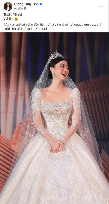 Tối 3/2, Hoa hậu Lương Thùy Linh khiến cả mạng xã hội xôn xao khi bất ngờ đăng ảnh mặc váy cưới lên trang cá nhân, kèm theo đó là dòng chú thích: "Thôi... Tết rùi, vui lên".