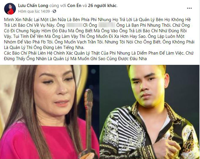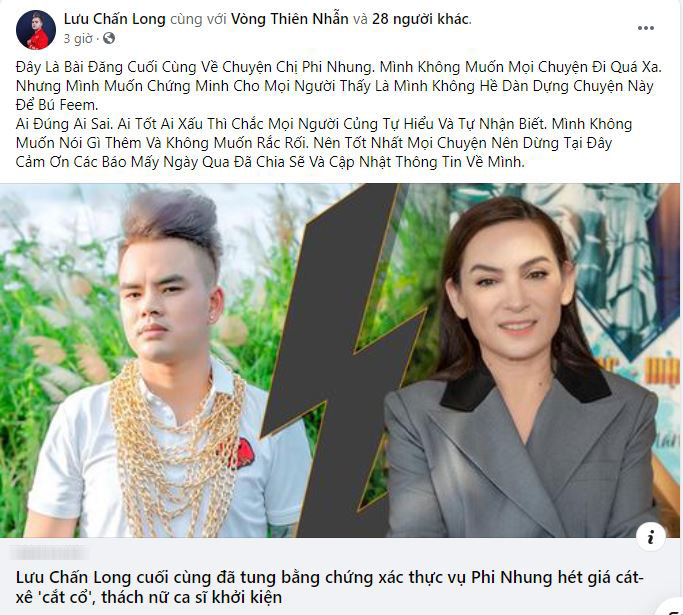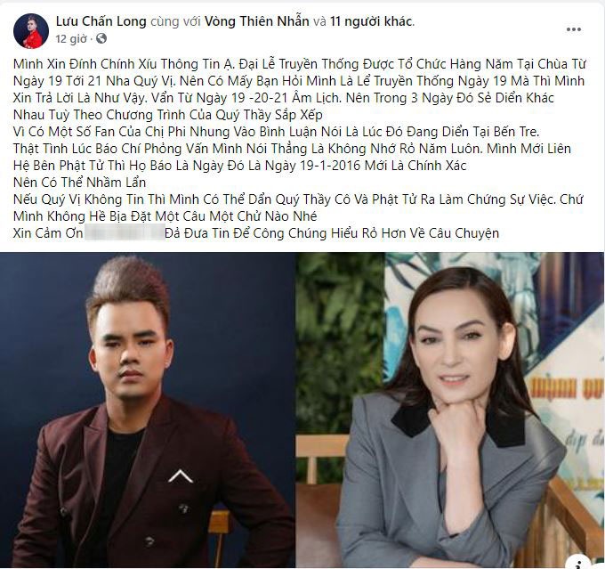 Bên cạnh đó, Lưu Chấn Long còn chia sẻ lại bài đăng của chính mình vào năm 2016, trong đó có thông báo về màn biểu diễn Phi Nhung và cả poster của nữ ca sĩ. "Đây là hình ảnh của chương trình ngày hôm đó. Vì thời gian qua gần 6 năm nên mình không nhớ rõ ngày. Ngày chính xác là ngày 19/1/2016 âm lịch. Tức ngày 26/2/2016 dương lịch. Chứ không phải là ngày 21/1/2017 như mình đã thông tin trước đó nhé. Cũng rất may hôm nay mình lục lại được hình ảnh này. Để gửi tới các Fan hâm mộ cuồng nhiệt của chị Phi Phi đang cố gắng ra sức bảo vệ cho chị nhé", nam ca sĩ viết.