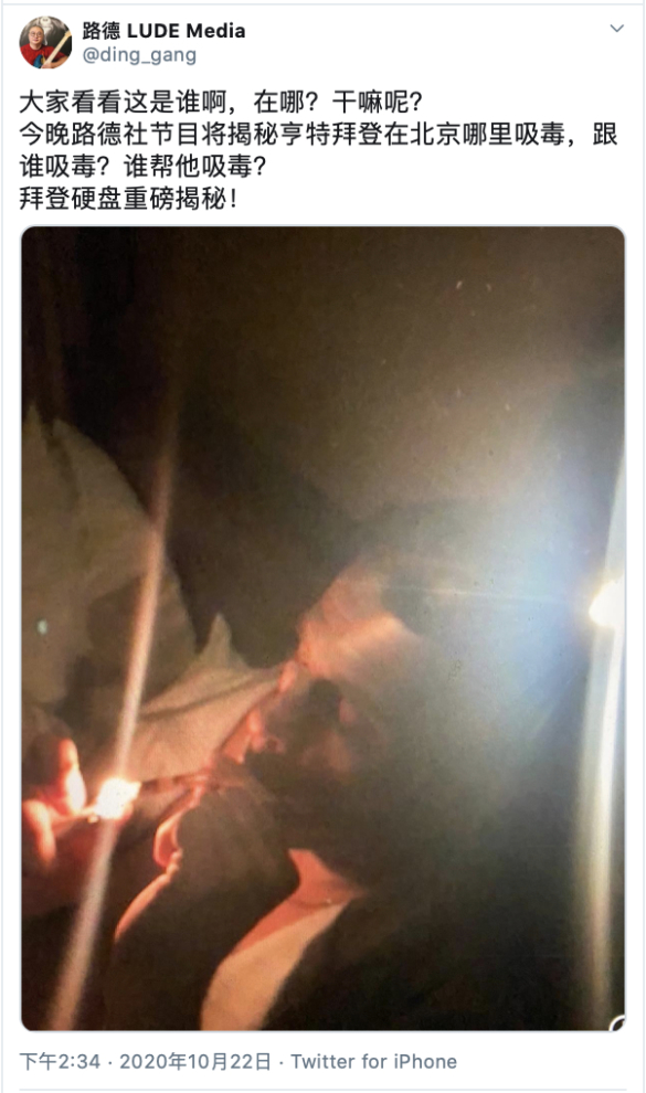 Quá khứ ăn chơi thác loạn của Hunter Biden cũng được kênh Lude Media đăng tải thời gian gần đây. Cụ thể, kênh này công bố một bức ảnh chụp màn hình một đoạn camera giấu kín, được quay trong một căn phòng tại câu lạc bộ tư nhân trong chuyến đi của Hunter Biden đến Bắc Kinh vào năm 2013.
