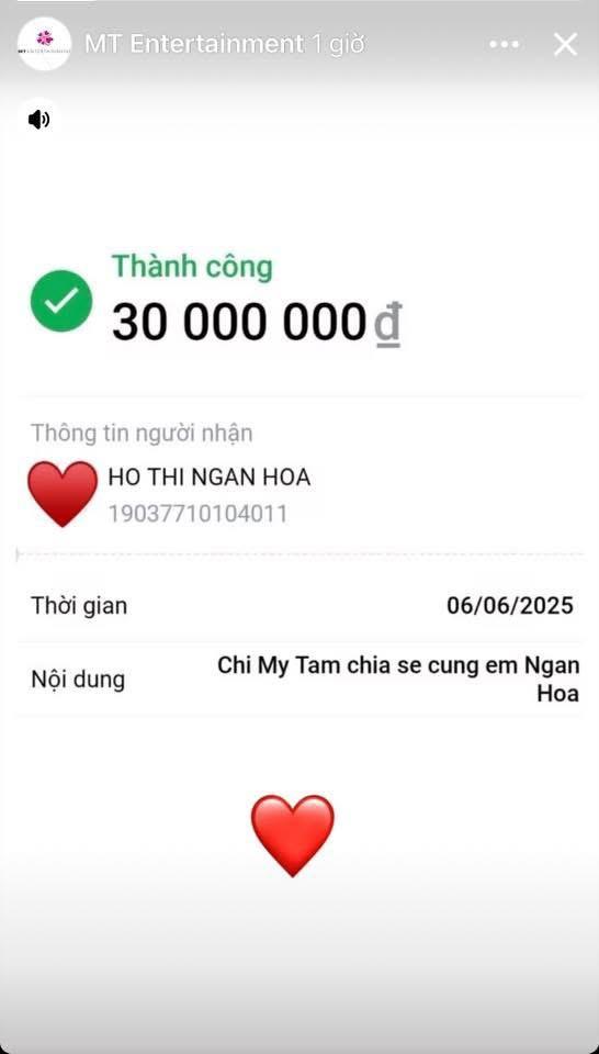 Mới đây, ca sĩ Mỹ Tâm cũng đăng thông tin giao dịch chuyển 30 triệu đồng vào tài khoản cá nhân của diễn viên Ngân Hoà. Ngoài ra, còn rất nhiều nghệ sĩ đã lan toả thông tin, gửi tiền đến Ngân Hoà nhưng không công bố con số. Không chỉ sao Việt mà khán giả cũng đóng góp trực tiếp vào tài khoản của Ngân Hoà. Chỉ sau 1 ngày, nữ diễn viên cho biết cô đã đủ số tiền trước mắt, việc chữa trị về sau sẽ tự xoay sở. Cũng từ thời điểm đó, Ngân Hoà thông báo ngừng nhận hỗ trợ, Trấn Thành xoá bài đăng lêu gọi.