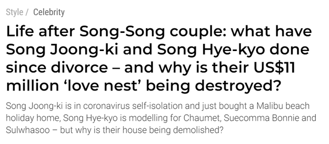 Tờ báo tiếng Anh SCMP của Hong Kong đã đăng tải thông tin liên quan tới lý do đến thời điểm này Song Joong Ki mới cho phá căn nhà tân hôn từng mua khi về chung một nhà Song Hye Kyo. Theo tờ International Business Times, biệt thự ở khu Itaewon được mua với số tiền 11,6 triệu USD (hơn 200 tỷ đồng).