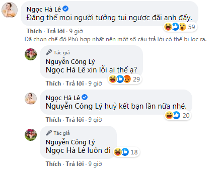 Dưới bài viết của Công Lý nhiều người hâm mộ đã để lại nhiều bình luận hài hước. Đặc biệt Ngọc Hà – vợ của nghệ sĩ Công Lý cũng vào bình luận "dằn mặt" chồng. Cô viết: “Đăng thế mọi người tưởng tui ngược đãi anh đấy”.