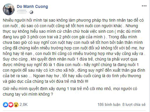 Thấy Đỗ Mạnh Cường hạnh phúc với cuộc sống hiện tại như vậy, nhiều người không khỏi thắc mắc tại sao anh không dùng biện pháp thụ tinh nhân tạo để có con ruột mà lại nhận con nuôi. NTK đã chia sẻ quan điểm về vấn đề này trên trang cá nhân: "Nhiều người hỏi mình tại sao không làm phương pháp thụ tinh nhân tạo để có con ruột, dù sao có con ruột cũng sẽ tốt hơn nuôi con người khác. Nhưng thực sự không hiểu sao mình cứ chần chừ hoài việc sinh con (mặc dù mình đang lưu giữ 3 phôi con trai và 2 phôi con gái của mình).