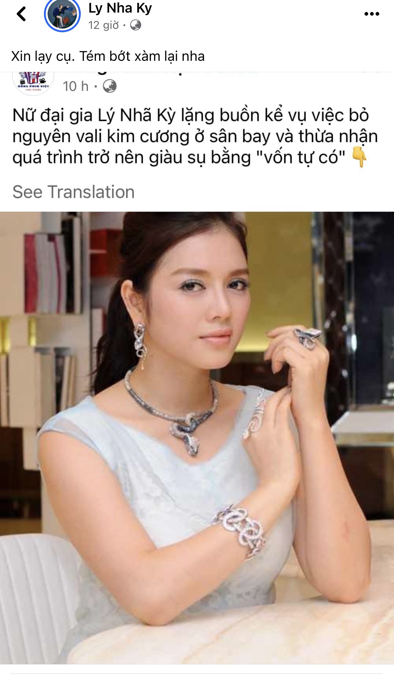 Cụ thể, trong bài viết này chia sẻ bức hình thuở mới vào showbiz của Lý Nhã Kỳ, gây chú ý khi đeo "núi" trang sức trên người. Kèm theo đó, bài đăng này còn tung tin nữ diễn viên sinh năm 1982 giàu có không phải do chăm chỉ làm việc, theo đuổi nghệ thuật hay kinh doanh.