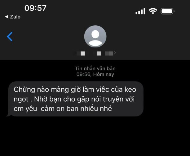 Chưa dừng lại ở đó, nhân vật này tiếp tục gửi tin nhắn qua quản lý của Lý Nhã Kỳ: "Chừng nào là giờ làm việc của Kẹo ngọt. Nhờ bạn cho gặp nói chuyện với em yêu. Cảm ơn bạn nhiều nhé".