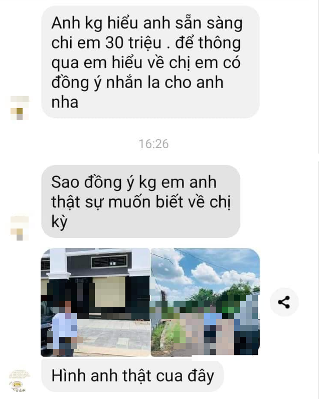 Nội dung tin nhắn người này viêt: "Anh không hiểu. Anh sẵn sàng chi em 30 triệu để thông qua em, hiểu về chị. Em có đồng ý, nhắn lại cho anh nha", "Sao, đồng ý không em? Anh thật sự muốn biết về chị Kỳ".