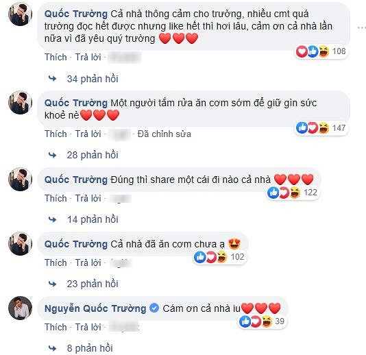 Bên dưới bình luận, Vũ "Sở Khanh" tích cực giao lưu với người hâm mộ, thậm chí còn xin lỗi vì không thể trả lời hết bình luận của các fan. Theo dõi những cuộc trò chuyện của Quốc Trường và dân mạng, có thể thấy anh vẫn giữ tinh thần vui vẻ, lạc quan, không quan tâm đến những tin đồn xoay quanh nghi án lộ tin nhắn nhạy cảm gần đây.