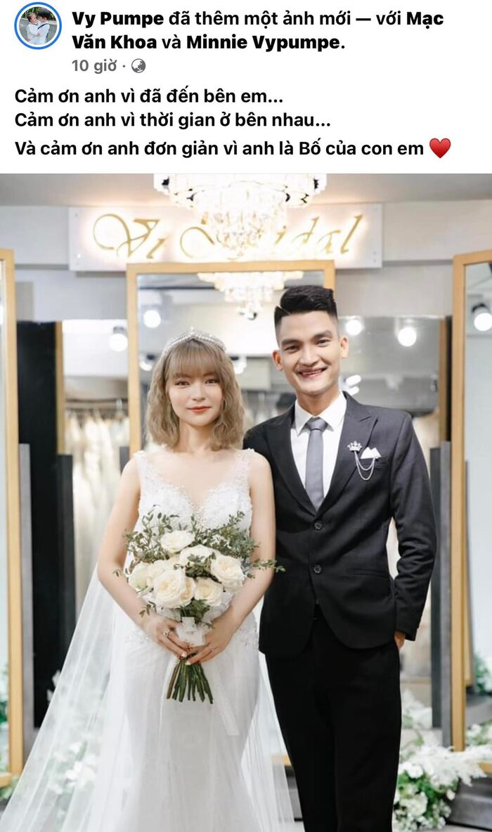Trên trang cá nhân Facebook, Mạc Văn Khoa đăng tải bộ ảnh cưới bên bà xã Vy Pumpe thông báo chính thức lên xe hoa.