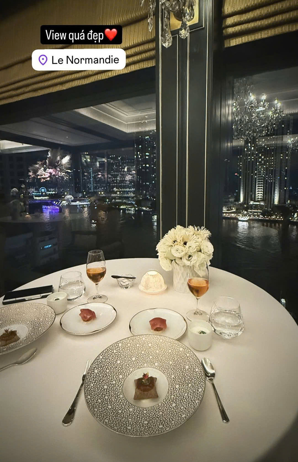 Trên trang cá nhân, Mai Ngọc cũng rất chăm chỉ cập nhật những hình ảnh trong chuyến trăng mật. Vợ chồng người đẹp nghỉ ngơi tại khách sạn hạng sang ở Bangkok. Khi vừa đến nơi, cô đã hào hứng khoe căn phòng rộng rãi, sang trọng, có hồ bơi riêng. Sau đó, vợ chồng Mai Ngọc cùng nhau thưởng thức những bữa ăn cao cấp ở nhà hàng món Nhật, dùng bữa tối tại bàn có view đẹp nhất nhìn ra sông của nhà hàng sao Michelin.