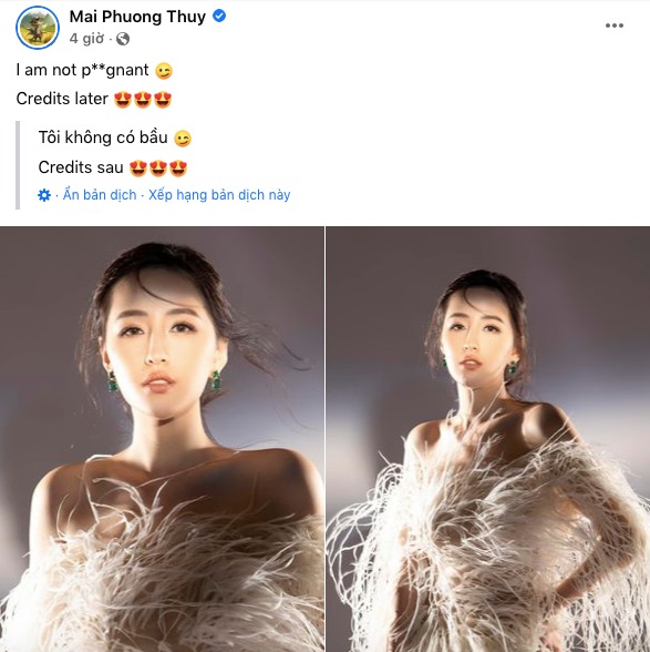 Mới đây trên trang cá nhân, Mai Phương Thúy đã quyết định chơi lớn khi diện trang phúc không nội y. Tuy nhiên để tránh những hiểu lầm không đáng có từ netizen, người đẹp đã lên tiếng ngay từ đầu.