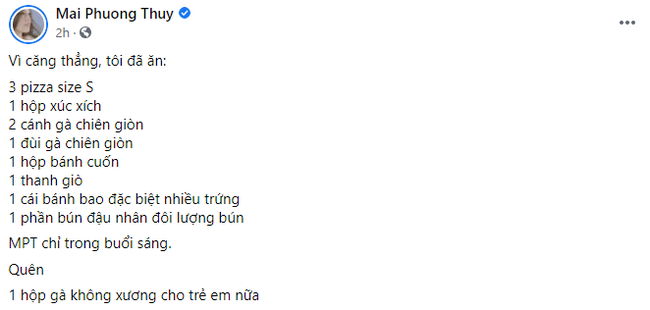Cụ thể, Mai Phương Thúy tiết lộ rằng: "Vì căng thẳng, tôi đã ăn: 3 pizza size S, 1 hộp xúc xích, 2 cánh gà chiên giòn, 1 đùi gà chiên giòn, 1 hộp bánh cuốn, 1 thanh giò, 1 cái bánh bao đặc biệt nhiều trứng, 1 phần bún đậu nhân đôi lượng bún… 1 hộp gà không xương cho trẻ em nữa". Tất cả chỉ được Mai Phương Thúy ăn hết trong một buổi sáng.
