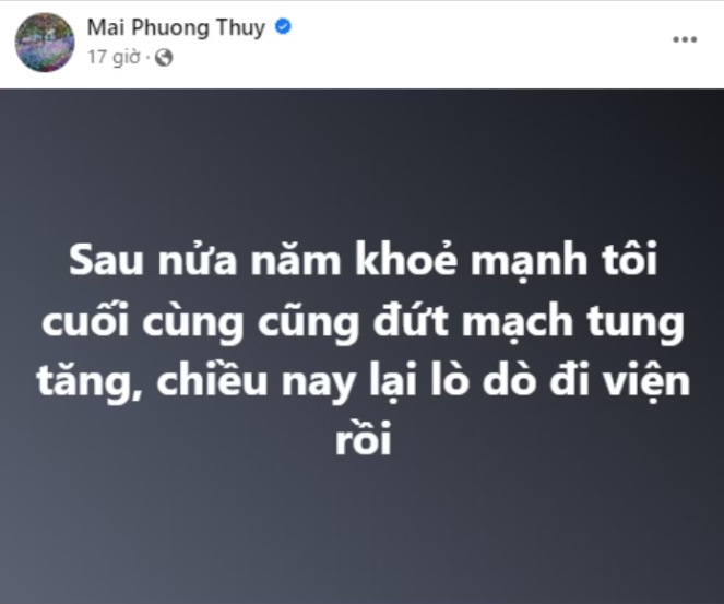 "Sau nửa năm khoẻ mạnh tôi cuối cùng cũng đứt mạch tung tăng, chiều nay lại lò dò đi viện rồi". Dòng trạng thái mới đây cho thấy sự thất vọng của cô về tình hình của mình. Dưới phần bình luận, nhiều người thân, bạn bè và các fan đã thay nhau an ủi Mai Phương Thúy và hi vọng cô sớm khỏi bệnh để trở lại với cuộc sống thường nhật.