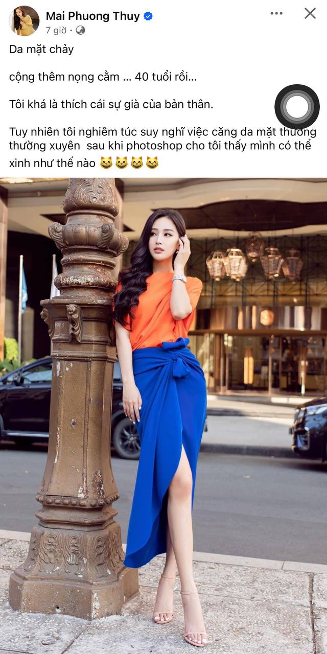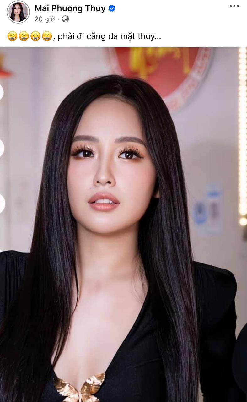 Mới đây, nàng hậu 8x đã đăng tải hình ảnh mới trên trang cá nhân và chia sẻ nửa đùa nửa thật dự định chuẩn bị can thiệp thẩm mỹ ở vùng mặt. Mai Phương Thúy cho hay: "Phải đi căng da mặt thôi". Vài ngày trước đó, người đẹp cũng than thở chuyện nhan sắc trên trang cá nhân: "Da mặt chảy, cộng thêm nọng cằm, 40 tuổi rồi. Tôi khá là thích cái sự già của bản thân. Tuy nhiên, tôi nghiêm túc suy nghĩ việc căng da mặt thường xuyên sau khi photoshop cho tôi thấy mình có thể xinh như thế nào".