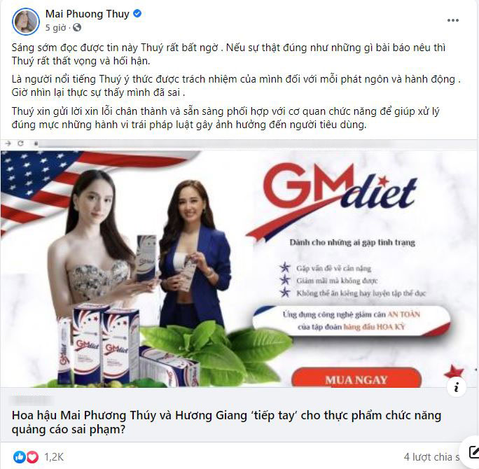 Mới đây, Hoa hậu Mai Phương Thúy và Hương Giang đã bị gọi tên khi quảng cáo cho một nhãn hàng giảm cân bị cơ quan chức năng "tuýt còi". Cụ thể, vào tháng 3/2021, Mai Phương Thuý xuất hiện trong video "** **** - Bí Mật Giúp Hoa Hậu Mai Phương Thúy có Vóc Dáng Chuẩn". Tại đây, cô dành nhiều lời khen ngợi cho sản phẩm giảm cân này. "Thuý có một bí quyết để giảm cân trong thời gian ngắn như vậy, có hiệu quả rõ rệt mà không có tác dụng phụ đó chính là ** ****. Thuý dùng để thay cho bữa sáng. Nó rất là ngon, bản thân Thuý quen sung sướng rồi nên không thể nào dùng cái gì mà mình cảm thấy khó chịu được", Mai Phương Thuý nói trong clip.