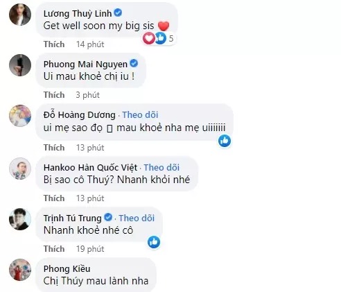 Dưới bài viết, nhiều sao Việt như hoa hậu Lương Thùy Linh, MC Phương Mai, diễn viên Trịnh Tú Trung... bày tỏ sự lo lắng cho Mai Phương Thúy, chúc nàng hậu mau chóng bình phục.