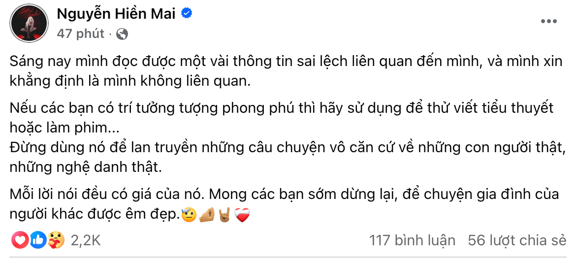 Chiều ngày 18/1, cái tên MaiQuinn trở thành tâm điểm chú ý khi cô trực tiếp đăng đàn làm rõ những ồn ào đời tư. Trên trang cá nhân, nữ ca sĩ bày tỏ sự bức xúc trước những thông tin sai lệch đang nhắm vào mình. Cô thẳng thắn nhắn nhủ những người đang thêu dệt câu chuyện: "Nếu các bạn có trí tưởng tượng phong phú thì hãy dùng để viết tiểu thuyết hoặc làm phim, đừng dùng nó để lan truyền những câu chuyện vô căn cứ về những con người thật, nghệ danh thật."