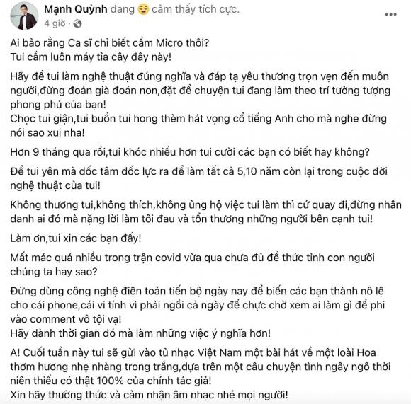 Mới đây nhất, Mạnh Quỳnh tiếp tục đăng tải một bức tâm thư khá dài lên trang cá nhân, bày tỏ mong muốn được hết sức làm nghệ thuật, đồng thời hy vọng không có ai đó suy xét mọi hành động của anh.