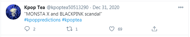 Mới đây, 1 tài khoản buôn chuyện Kpop đã dự đoán về scandal giữa BLACKPINK và nhóm nam nhà Starship - MONSTA X. Dòng trạng thái này đã khiến nhiều fan không khỏi tò mò, hoang mang vì từ trước đến nay, BLACKPINK và MONSTA X không hề có tương tác, thậm chí các cô gái "Hắc Hường" còn không tiếp xúc nhiều với những nhóm nam cùng nhà như iKon, WINNER, BIGBANG.