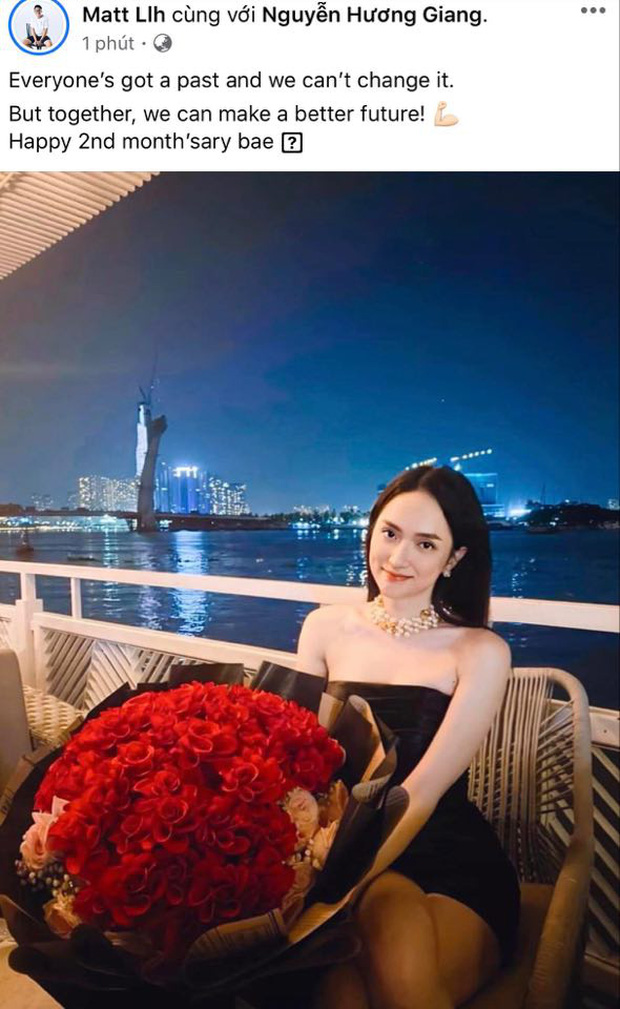 Cách đây ít giờ, trên trang cá nhân Matt Liu bất ngờ đăng tải khoảnh khắc ngọt ngào bên Hương Giang để kỷ niệm 2 tháng yêu nhau sau loạt ồn ào. Có thể thấy, Hương Giang vô cùng vui vẻ, hạnh phúc bên cạnh bạn trai trong ngày đặc biệt. Đây cũng là hình ảnh công khai đầu tiên của Matt Liu và Hương Giang bên nhau hậu sóng gió liên hoàn.