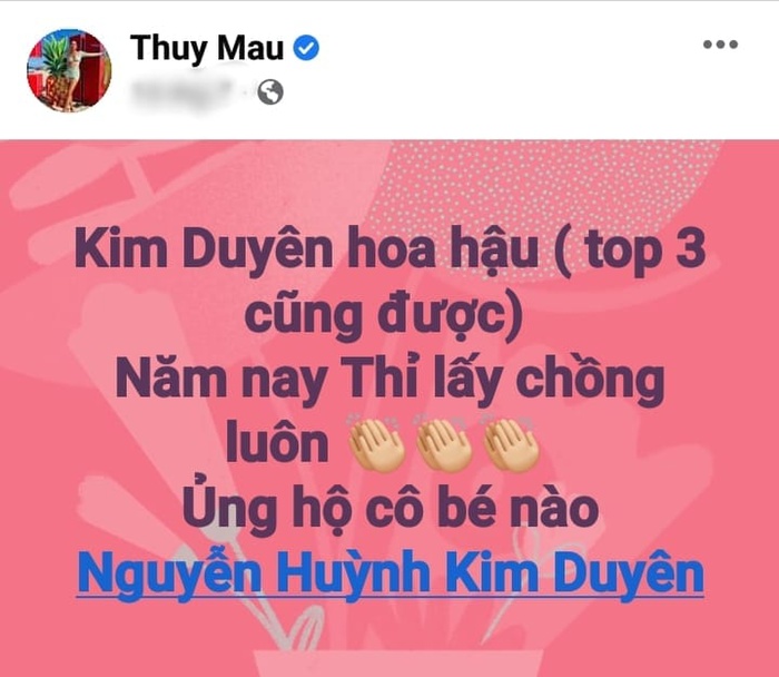 Trước đó, vào đêm thi chung kết Hoa hậu Siêu quốc gia 2022 của Kim Duyên, Mâu Thuỷ đã công khai lời hứa trên Facebook cá nhân với công chúng rằng: Nếu Kim Duyên Hoa hậu (hay Top 3), năm nay Thuỷ lấy chồng luôn. Ủng hộ cô bé nào!